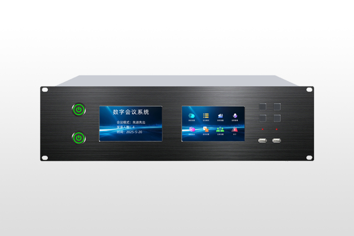 9、主機(jī)前面板配置2個(gè)5寸電容式觸摸液晶顯示屏,具有中英文顯示萬(wàn)年歷、時(shí)鐘功能,內(nèi)置功能菜單,可進(jìn)行會(huì)議管理功能。