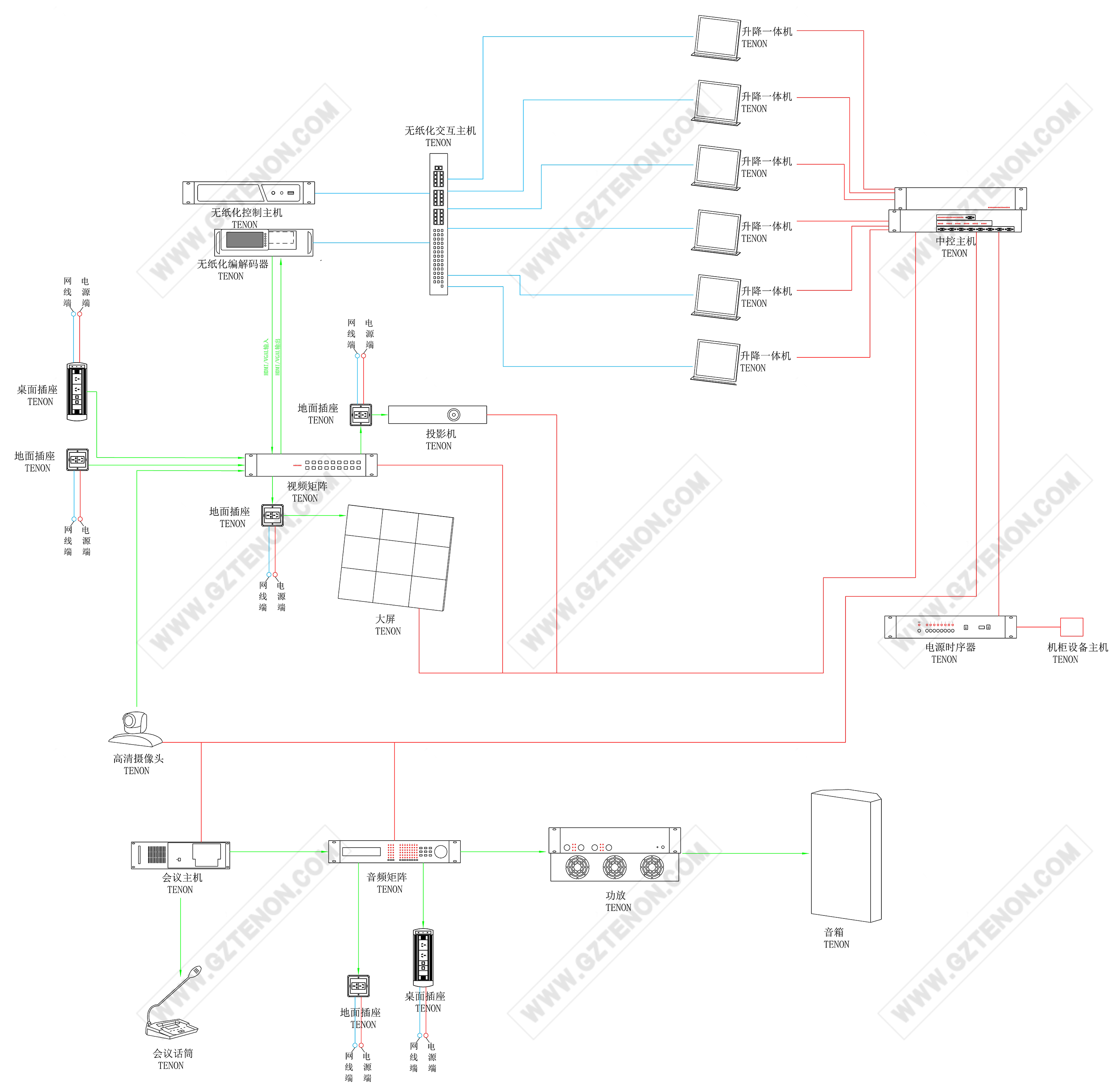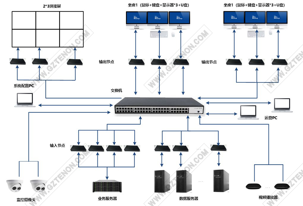 通過(guò)網(wǎng)絡(luò)實(shí)現(xiàn)指揮中心區(qū)域內(nèi)多類(lèi)型設(shè)備的集中管控,不僅可為應(yīng)用帶來(lái)更多的便捷,還具備完成集中控制燈光到開(kāi)關(guān)、會(huì)議終端到大屏幕及周邊的外設(shè)備都可以納入中央控制系統(tǒng)管理,提供完善的周邊的環(huán)境設(shè)備的管控。在會(huì)場(chǎng)使用中央控制主機(jī),配合專(zhuān)業(yè)電腦信號(hào)切換矩陣,及電源控制器等,讓受控信號(hào)與強(qiáng)電分離,減少干擾;實(shí)現(xiàn)投影、設(shè)備、音量等智能化一鍵式控制,有效保證設(shè)備的穩(wěn)定運(yùn)行與使用壽命。(指揮中心系統(tǒng)拓?fù)鋱D和指揮中心連接圖)