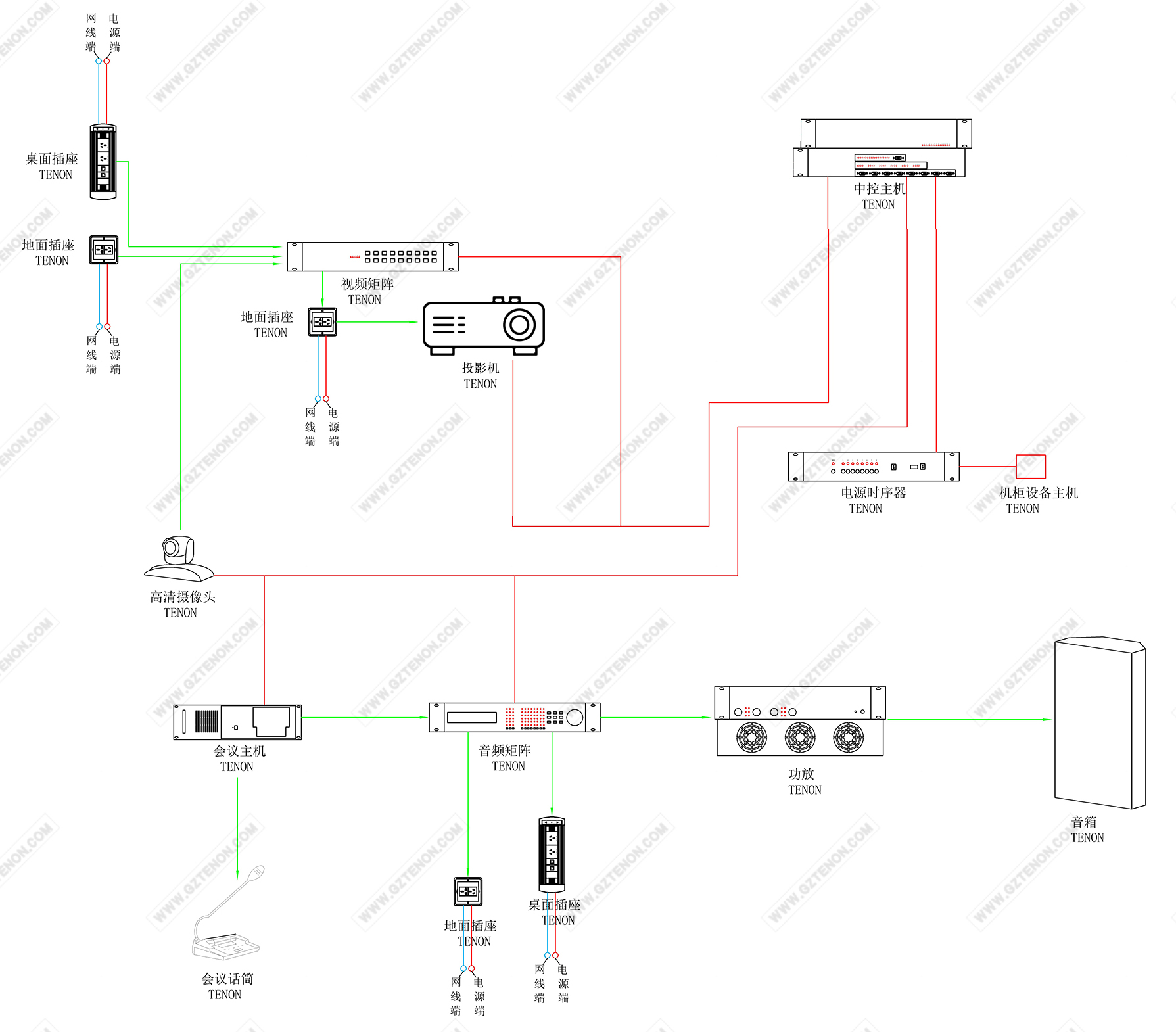 使用10.8寸無(wú)線觸摸屏做為主控制終端,在會(huì)場(chǎng)門(mén)旁嵌入7寸嵌入式觸控屏,進(jìn)入會(huì)場(chǎng)時(shí)便可控制會(huì)場(chǎng)環(huán)境。會(huì)場(chǎng)使用中央控制主機(jī),配合專(zhuān)業(yè)電腦信號(hào)切換矩陣,及電源控制器等,讓受控信號(hào)與強(qiáng)電分離,減少干擾;實(shí)現(xiàn)投影、設(shè)備、音量等智能化一鍵式控制,有效保證設(shè)備的穩(wěn)定運(yùn)行與使用壽命。